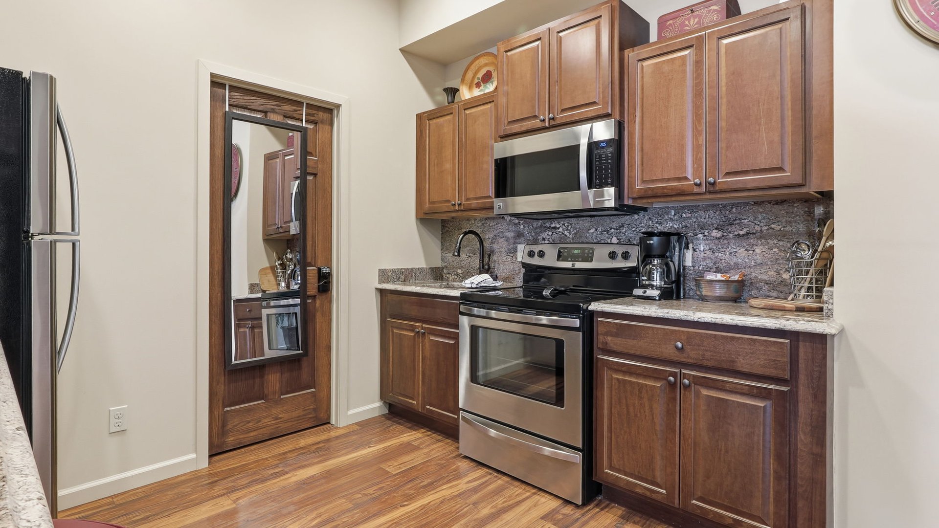The open-concept living space features a full kitchen equipped with a full-size oven and microwave—ideal for preparing meals during your stay. While this unit does not include an exterior balcony, it does have a sun room with French doors and a vaulted ceiling with a large window making it a great place to relax in the sun. This unit does not overlook the lake.