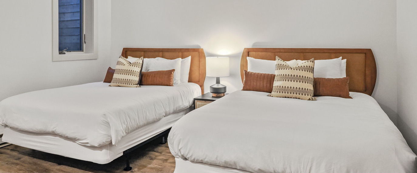 Primary Bedroom: Two queen beds, an ensuite bathroom with a custom-tiled shower.