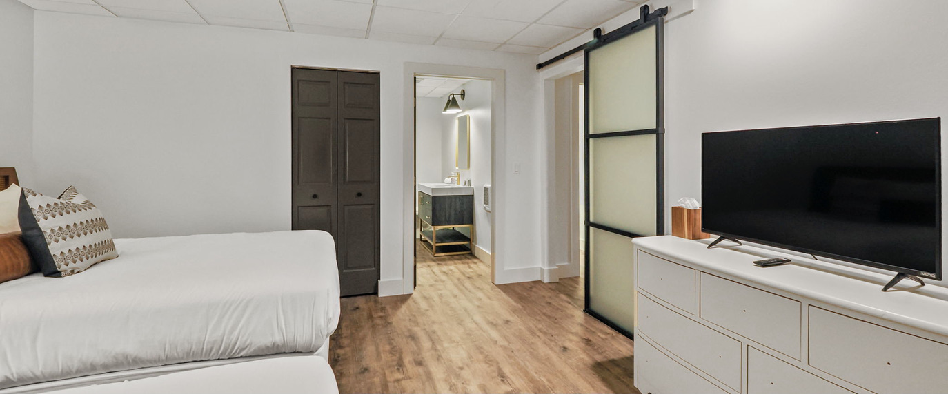 Step inside and enjoy the open-concept living space, where cozy whiskey-bar vibes meet sleek modern design. The full kitchen boasts stainless steel appliances, quartz countertops, and everything you need—from a standard coffee pot to a Keurig—for warming up after a day on the slopes. Relax in front of the Smart TV or recharge in one of the two stylish bedrooms: