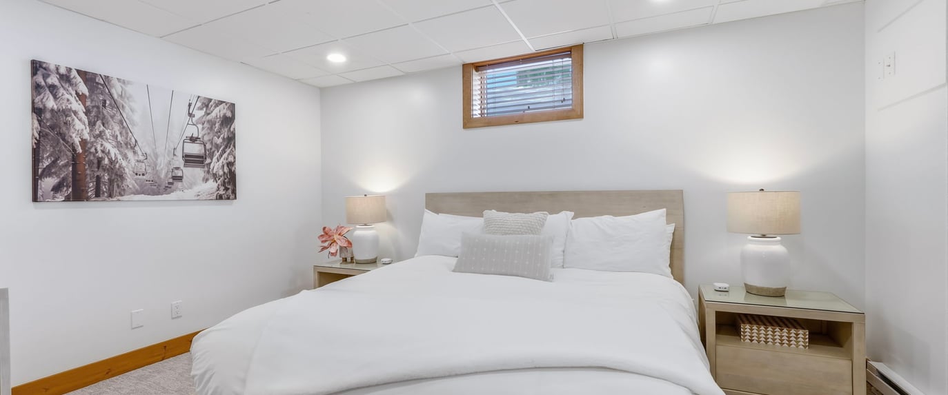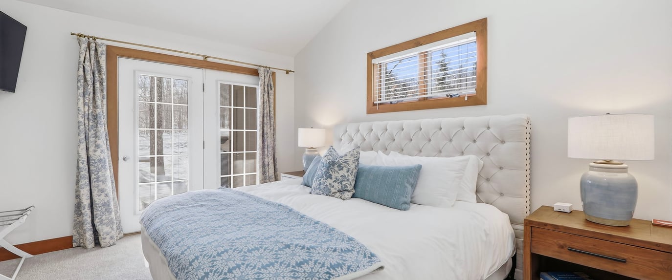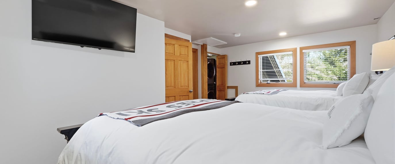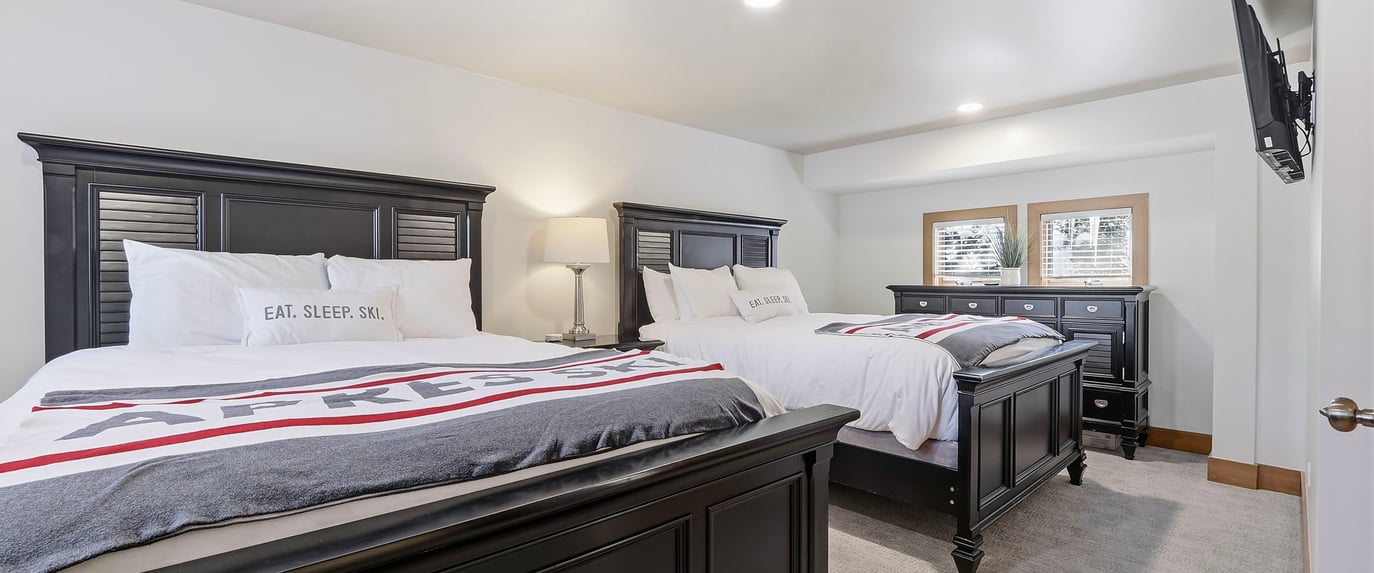 The master suite has a King bed, the second bedroom has two queen beds, and the upstairs bedroom has two queen beds. The lower level is a two bedroom condo with a King primary and 2 queen second bedroom.