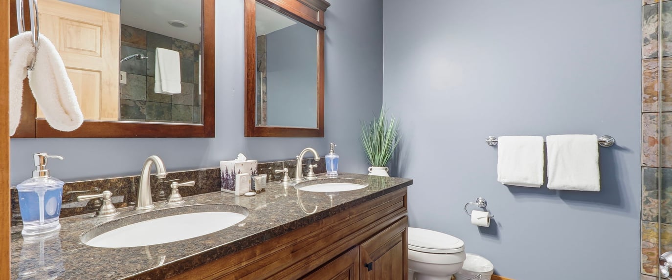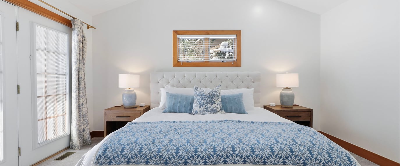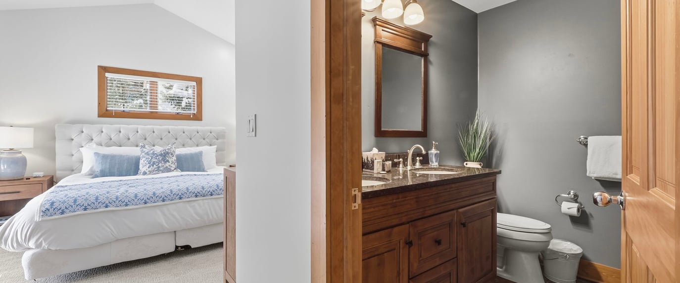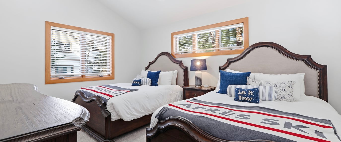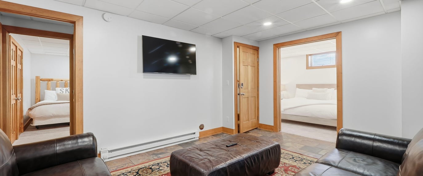 The master suite has a King bed, the second bedroom has two queen beds, and the upstairs bedroom has two queen beds. The lower level is a two bedroom condo with a King primary and 2 queen second bedroom.