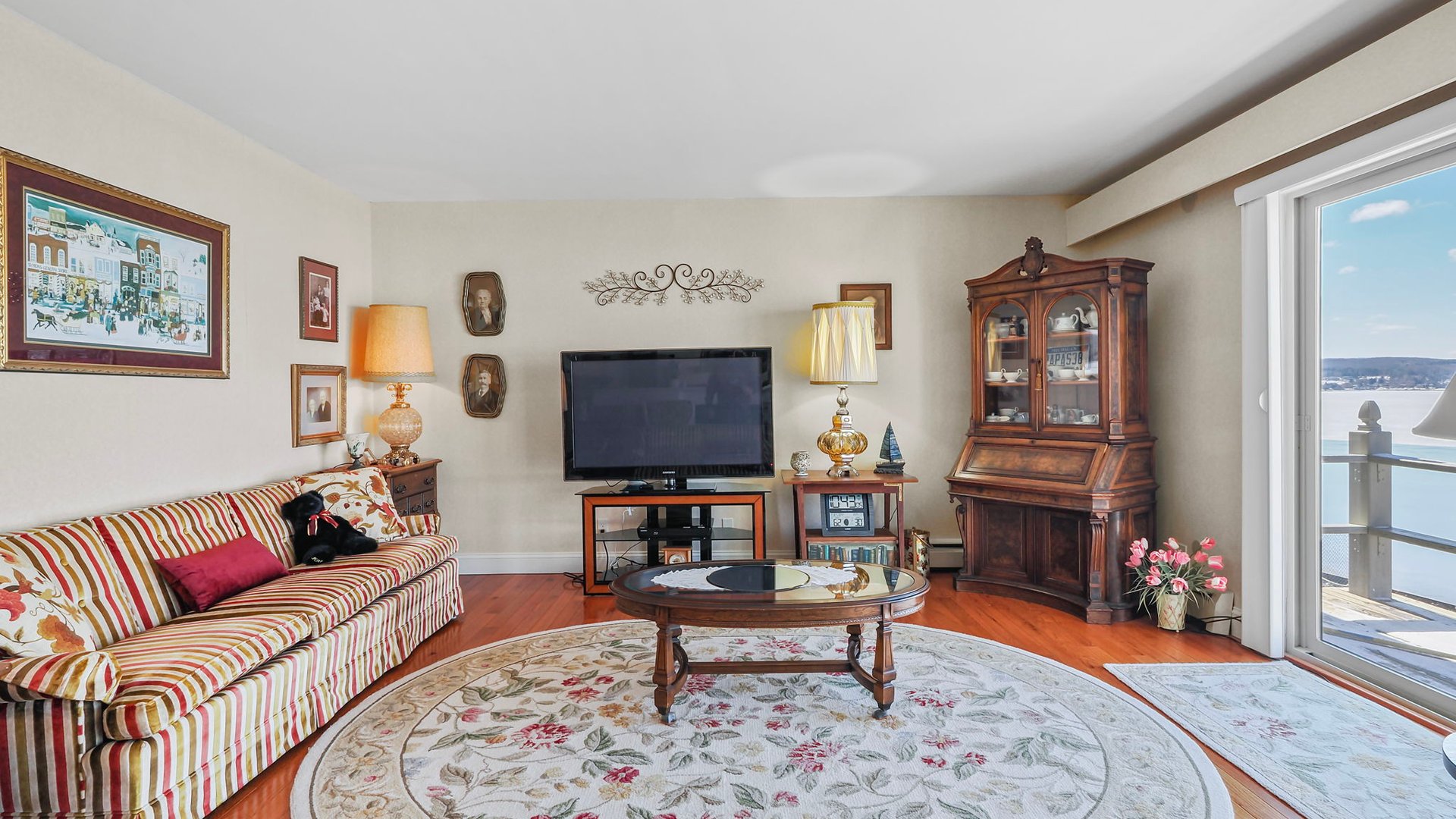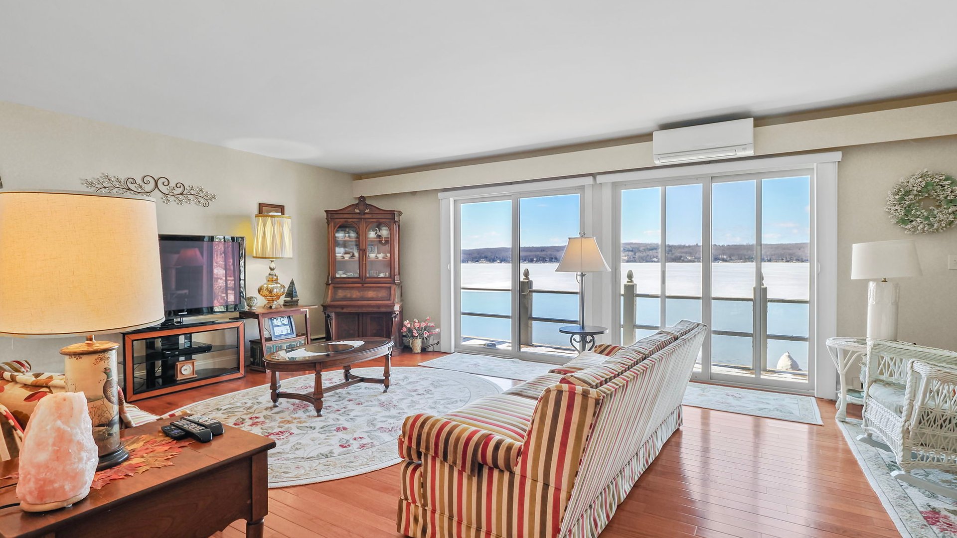 Bright, open-concept living room with cozy gas fireplace, private balcony overlooking Lake Charlevoix, Fully equipped kitchen and dining area with water views.