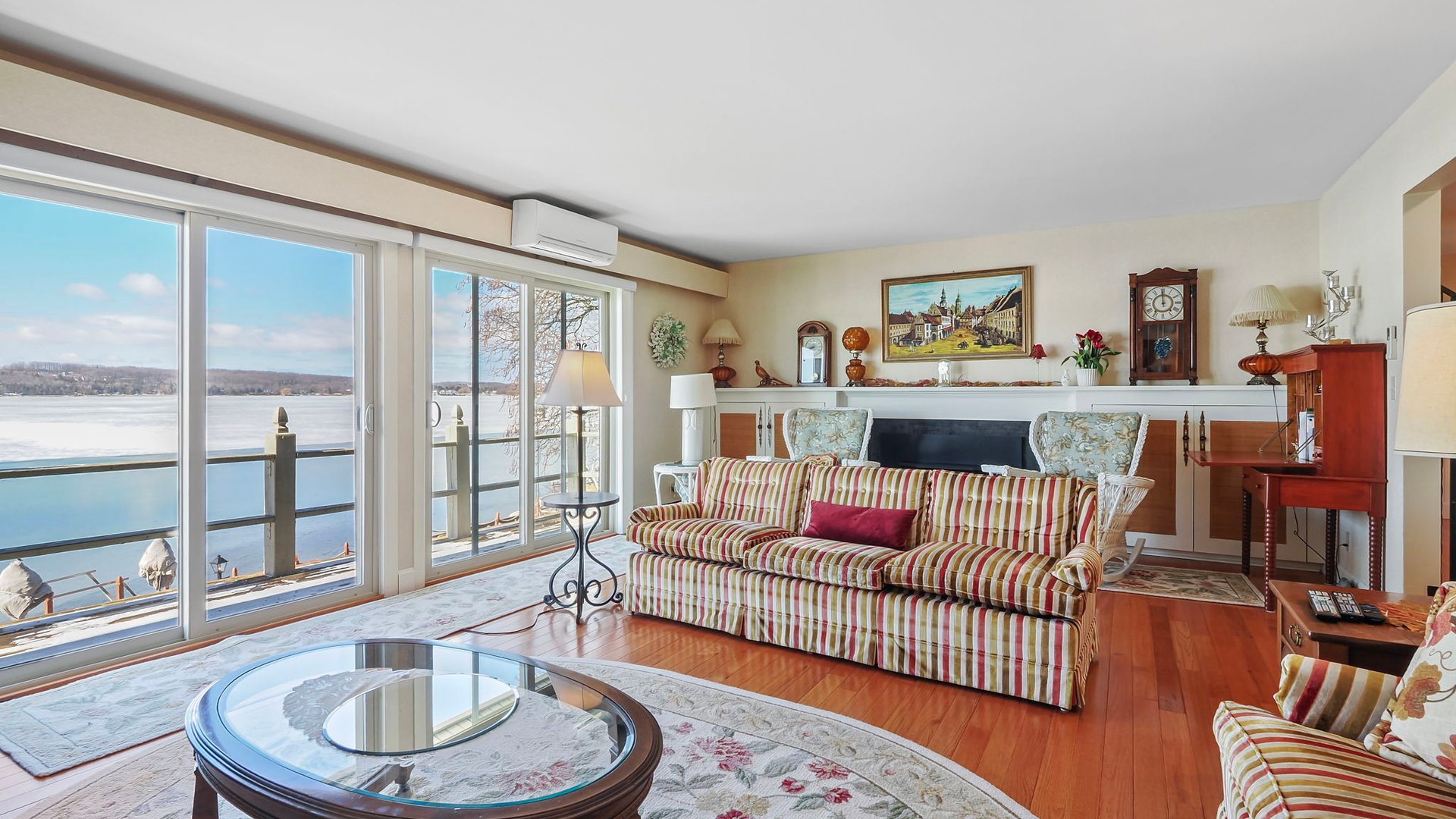 Walk-out access to lakeside patio with fireplace